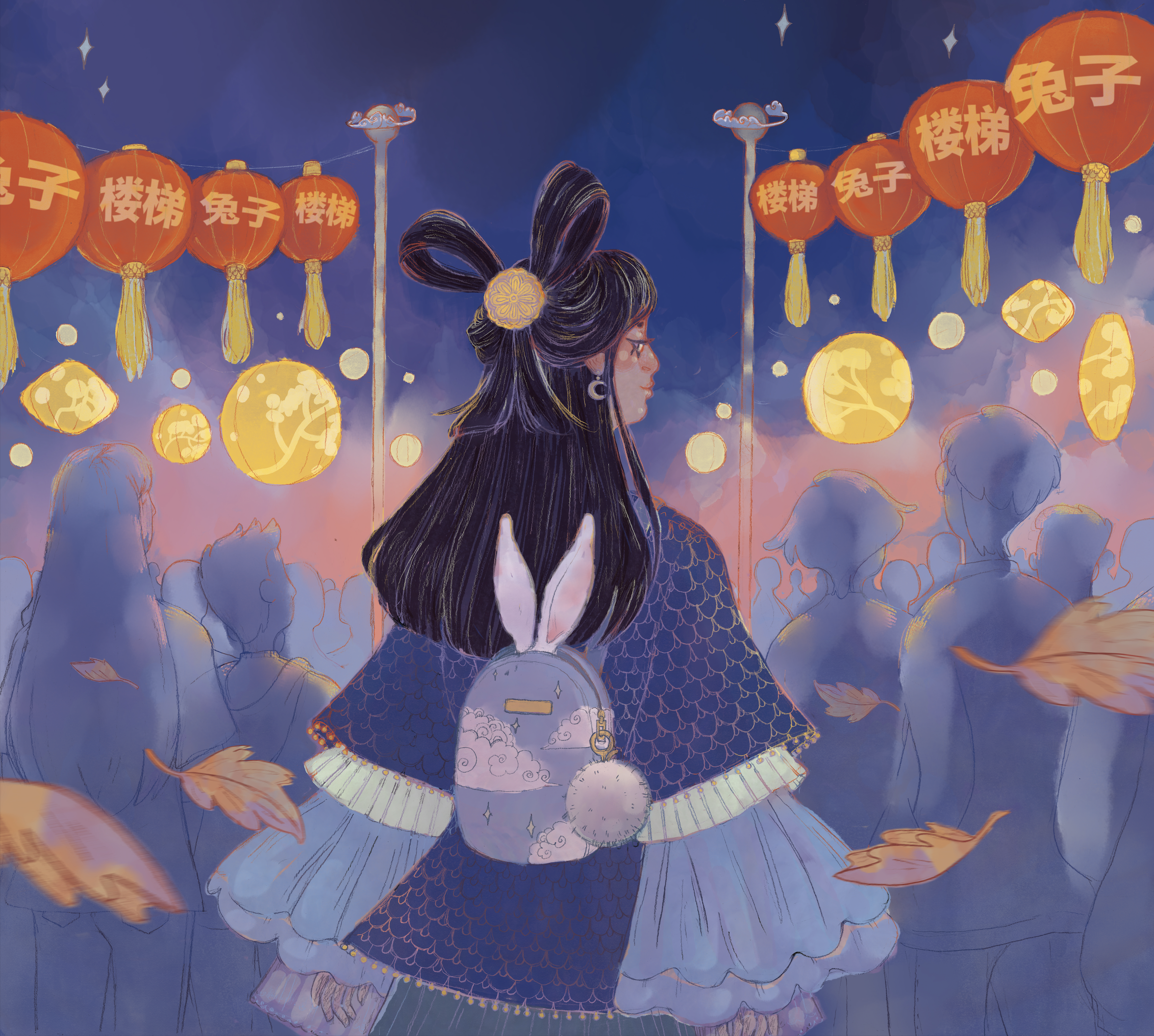 I illustrated a lush image to put users into the scene. Other inclusions include the mooncake that symbolizes the moon and family unity, and Chang’E with her rabbit companion. Other details like the moon mooncake and leaves blowing in the wind were also added
